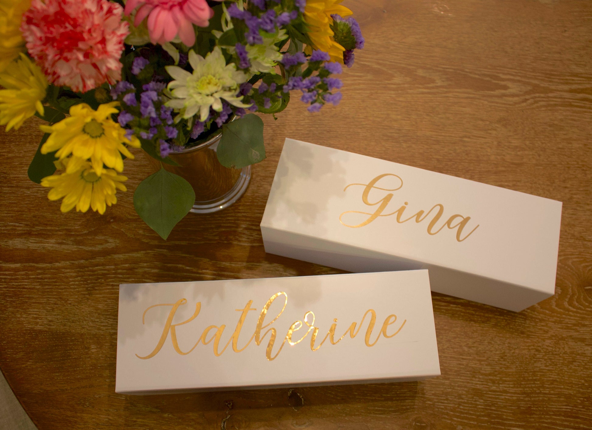 The Personalized Wine Gift Box. Makes a great bridesmaid proposal gift, groomsmen proposal gift. Measures 14" x 4.5" x 4.5" and holds regular sized bottle of wine. This box is EMPTY- WINE IS NOT INCLUDED. Regular size champagne bottles do NOT fit.