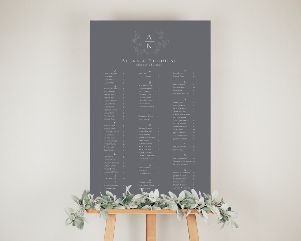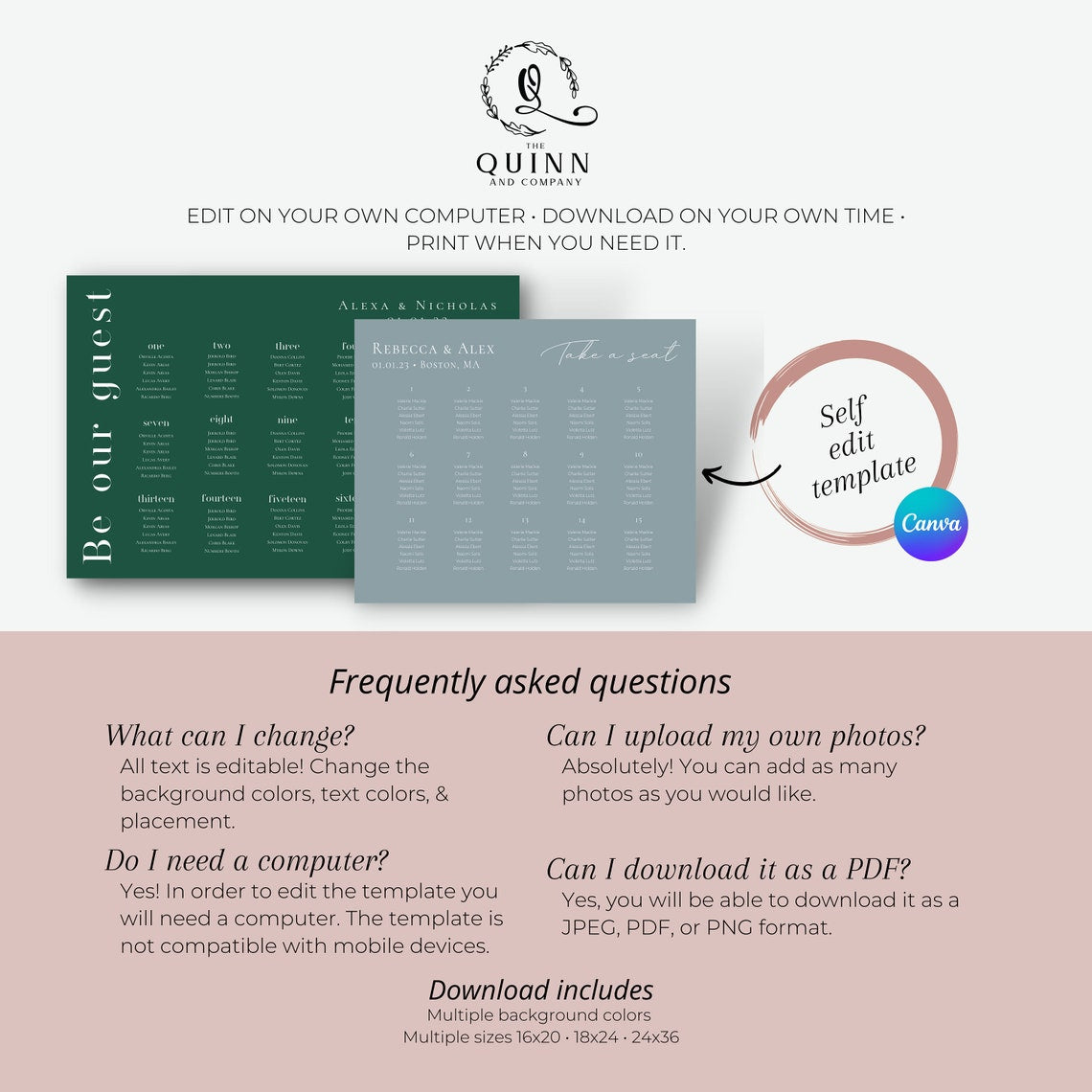 This minimalistic wedding seating chart template features modern fonts and simple designs that pair beautifully with many color palettes. You can easily edit the fonts and colors to better match your event. All you need is a FREE Canva account to edit and print from home. No software or font downloading necessary.