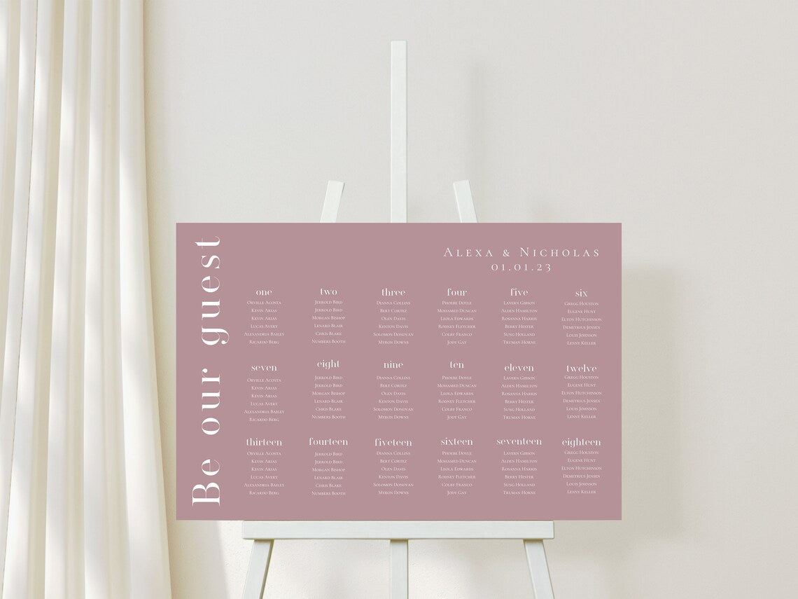 This minimalistic wedding seating chart template features modern fonts and simple designs that pair beautifully with many color palettes. You can easily edit the fonts and colors to better match your event. All you need is a FREE Canva account to edit and print from home. No software or font downloading necessary.