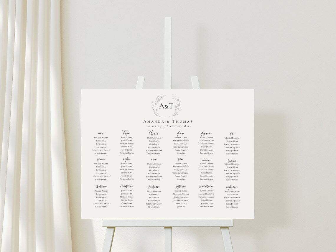 This minimalistic wedding seating chart template features modern fonts and simple designs that pair beautifully with many color palettes. You can easily edit the fonts and colors to better match your event. All you need is a FREE Canva account to edit and print from home. No software or font downloading necessary.