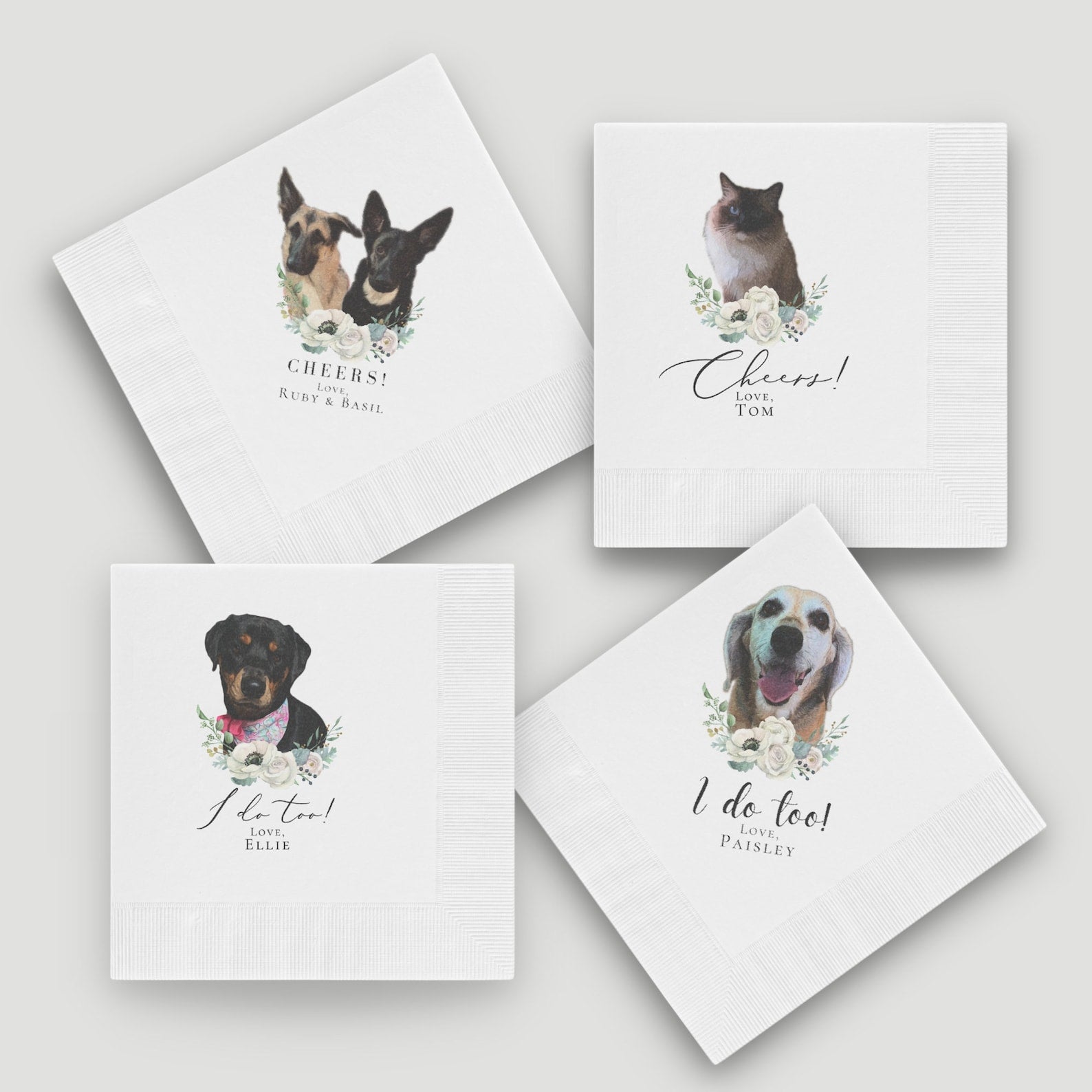 Add a fun personalized element to your event with these full color napkins. Your guests will love your attention to detail. Don't forget about your furry and lovable pets on your big day! Add a personal touch to your wedding, bridal shower, engagement party, rehearsal dinner or birthday party with our personalized cocktail napkins and your favorite pet. One color print only per design. All you have to do is let us know the name or occasion to personalize these beauties. Our beverage napkins make for great take home souvenirs. Prices and quantities vary. We suggest ordering 2-3 napkins per guest for each hour of your event.