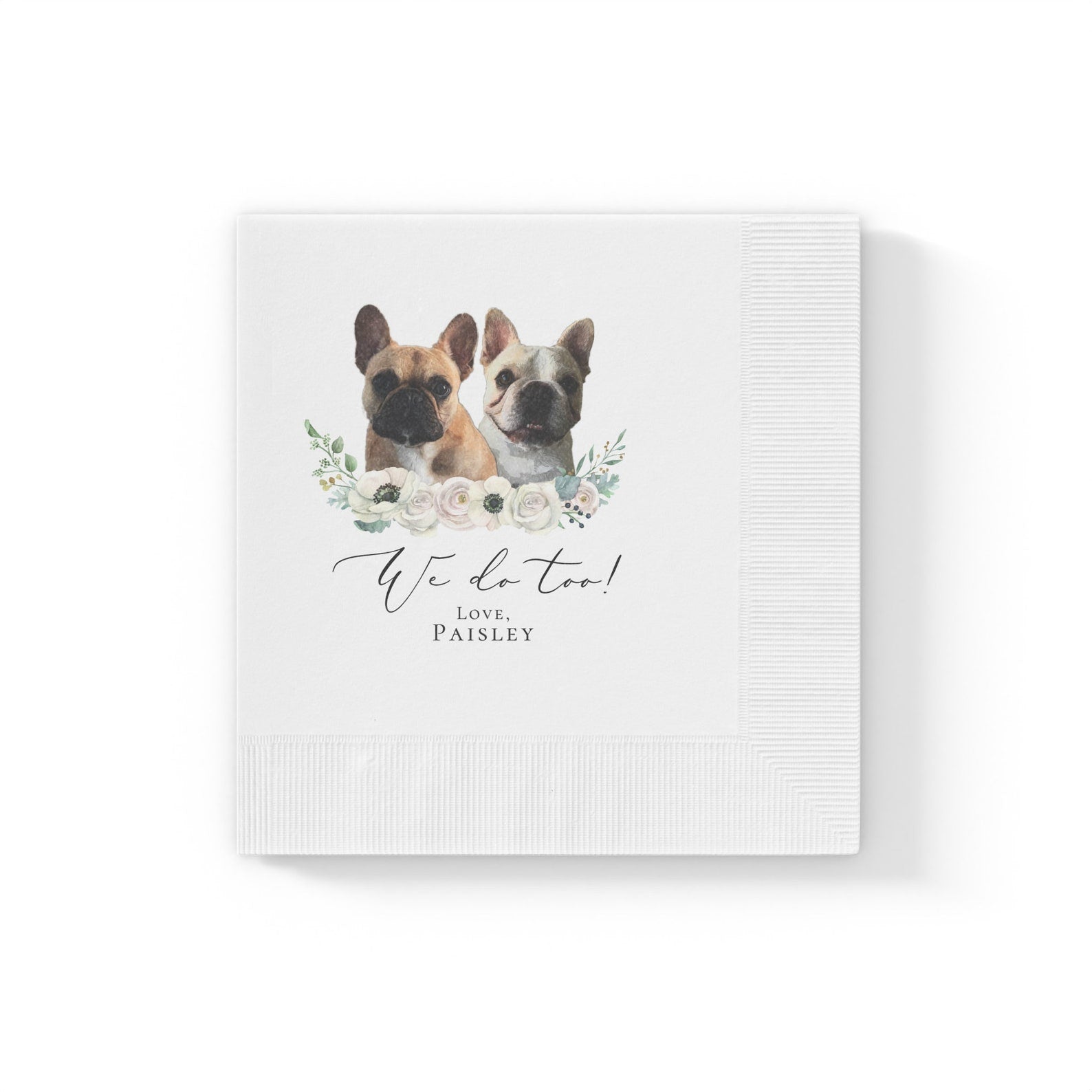 Add a fun personalized element to your event with these full color napkins. Your guests will love your attention to detail. Don't forget about your furry and lovable pets on your big day! Add a personal touch to your wedding, bridal shower, engagement party, rehearsal dinner or birthday party with our personalized cocktail napkins and your favorite pet. One color print only per design. All you have to do is let us know the name or occasion to personalize these beauties. Our beverage napkins make for great take home souvenirs. Prices and quantities vary. We suggest ordering 2-3 napkins per guest for each hour of your event.