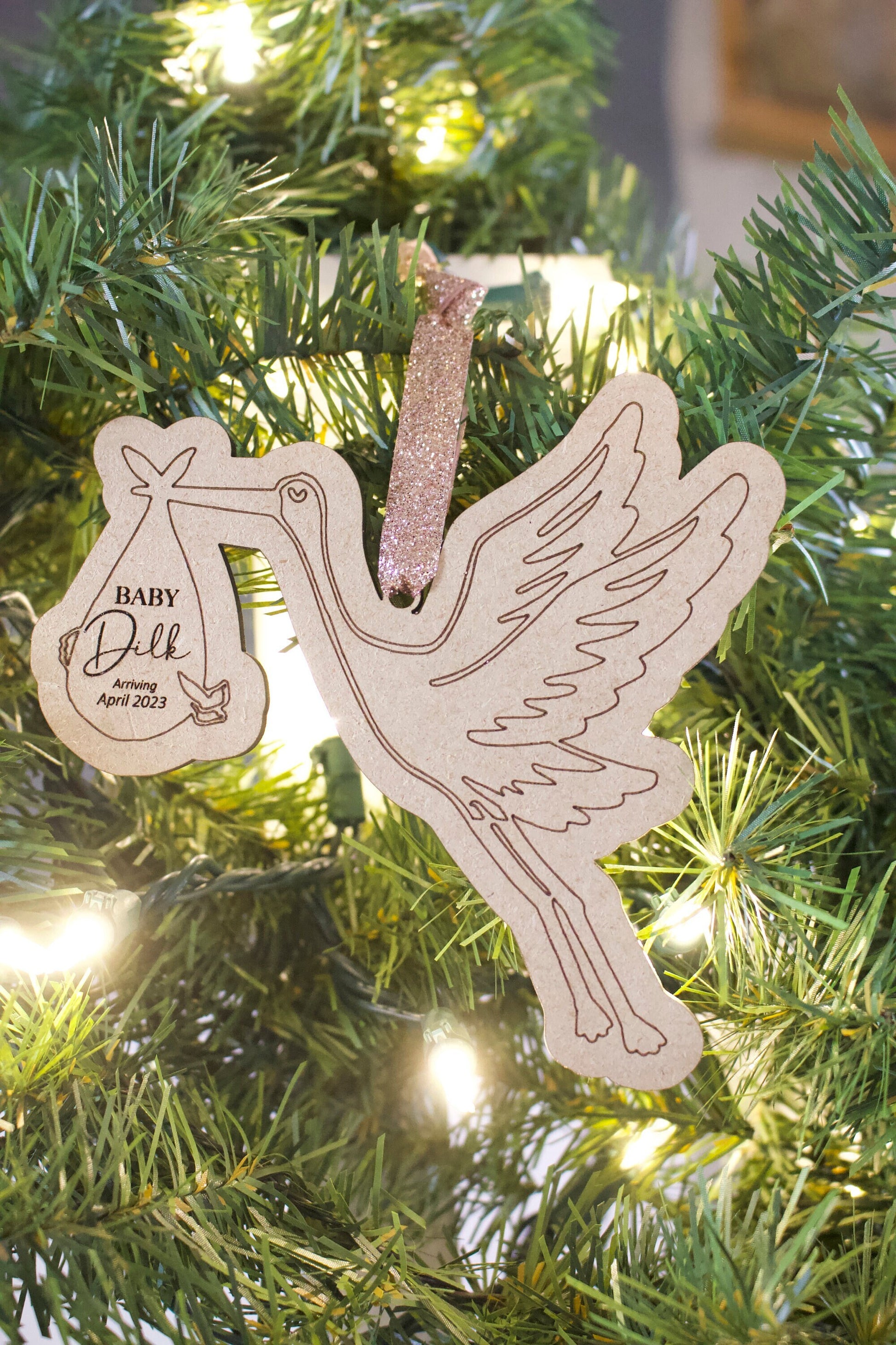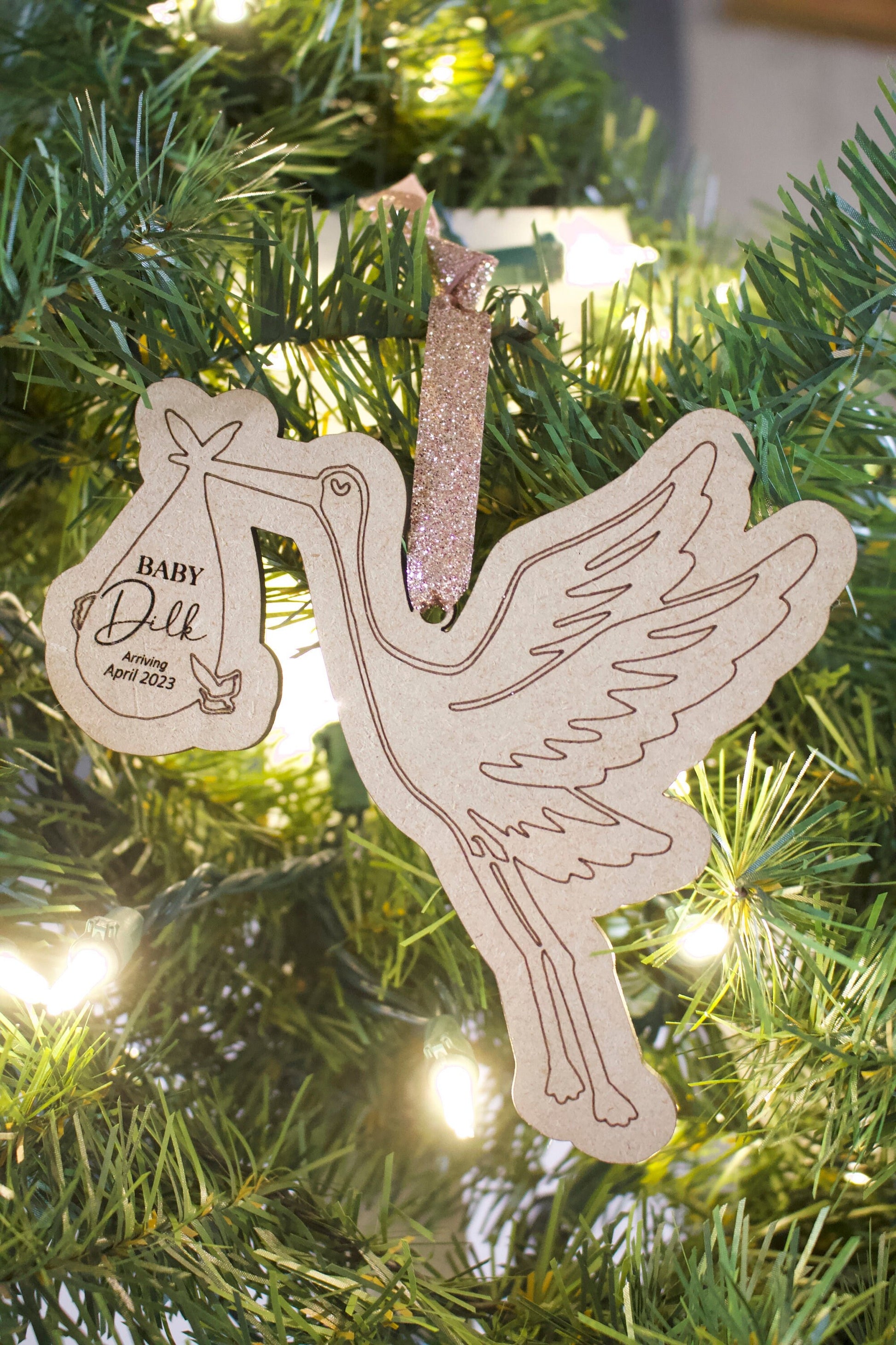 Stork Personalized Expecting Baby Coming Soon Natural Ornament Neutral Girl Boy Surprise Gender Wooden Laser Cut Engraved Baby Announcement